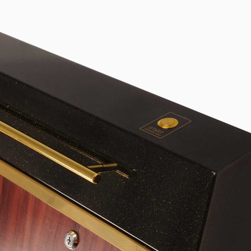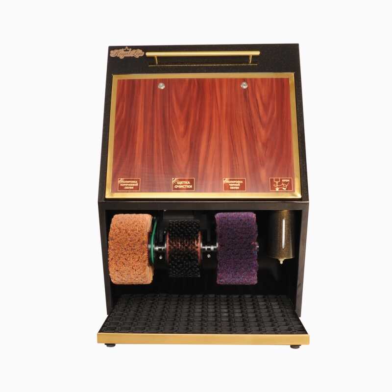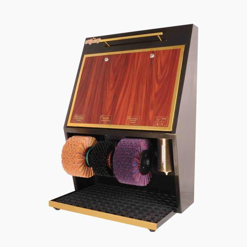 Корпус аппарата изготовлен из стали и окрашен двумя слоями полимерной краски, первый - черная глянцевая и второй - прозрачный лак с блестками под цвет фурнитуры золото либо хром. Данное покрытие придает аппарату насыщенный глубокий цвет особенно эффектно выглядит в лучах солнца и при хорошем освещении. Устройство комплектуется тремя широкими щётками полировки – для светлой, коричневой и темной обуви и жесткой щёткой для предварительной очистки.
