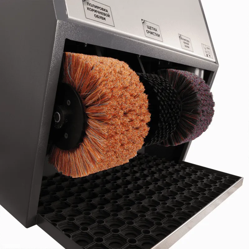 Устройство комплектуется двумя широкими щётками полировки – для светлой и темной обуви и жесткой щёткой для предварительной очистки.