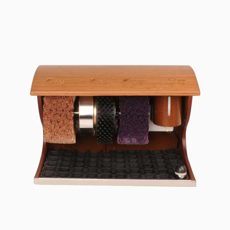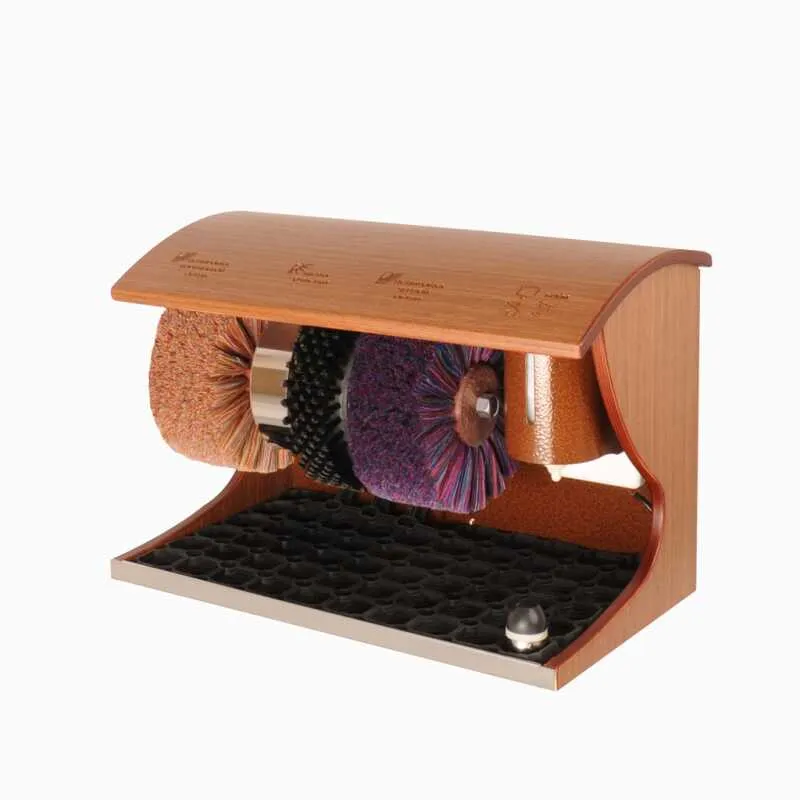 Устройство комплектуется двумя щётками для полировки - для светлой и темной обуви и жесткой щёткой для предварительной очистки.