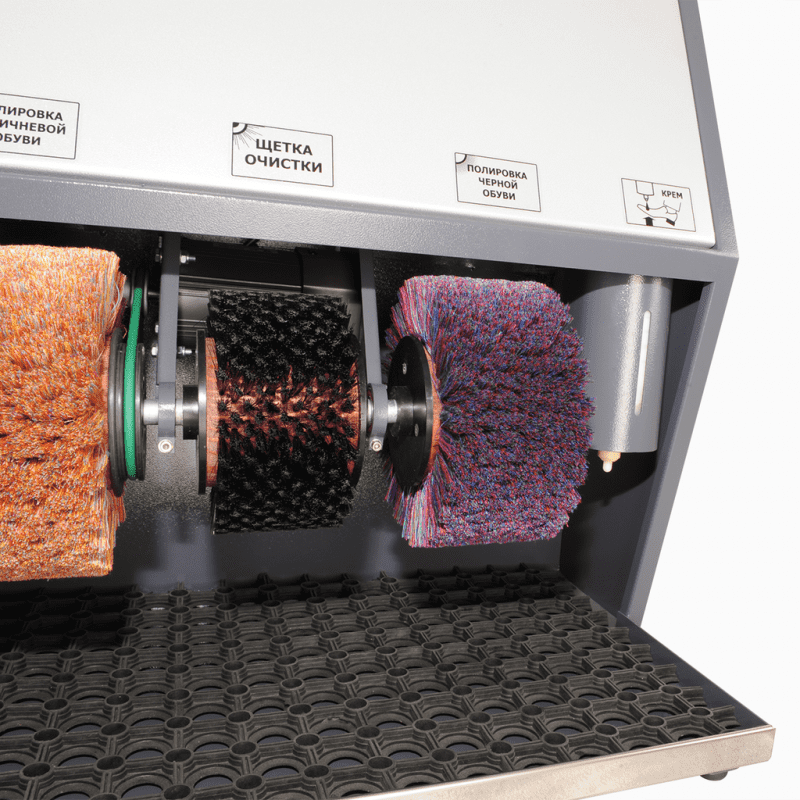 Устройство комплектуется двумя широкими щётками полировки – для светлой и темной обуви и жесткой щёткой для предварительной очистки.