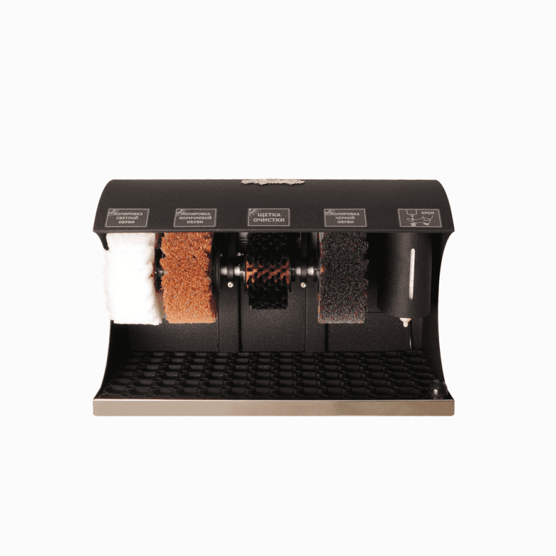 Устройство комплектуется тремя щётками полировки – для светлой, черной и коричневой обуви и жесткой щёткой для предварительной очистки.